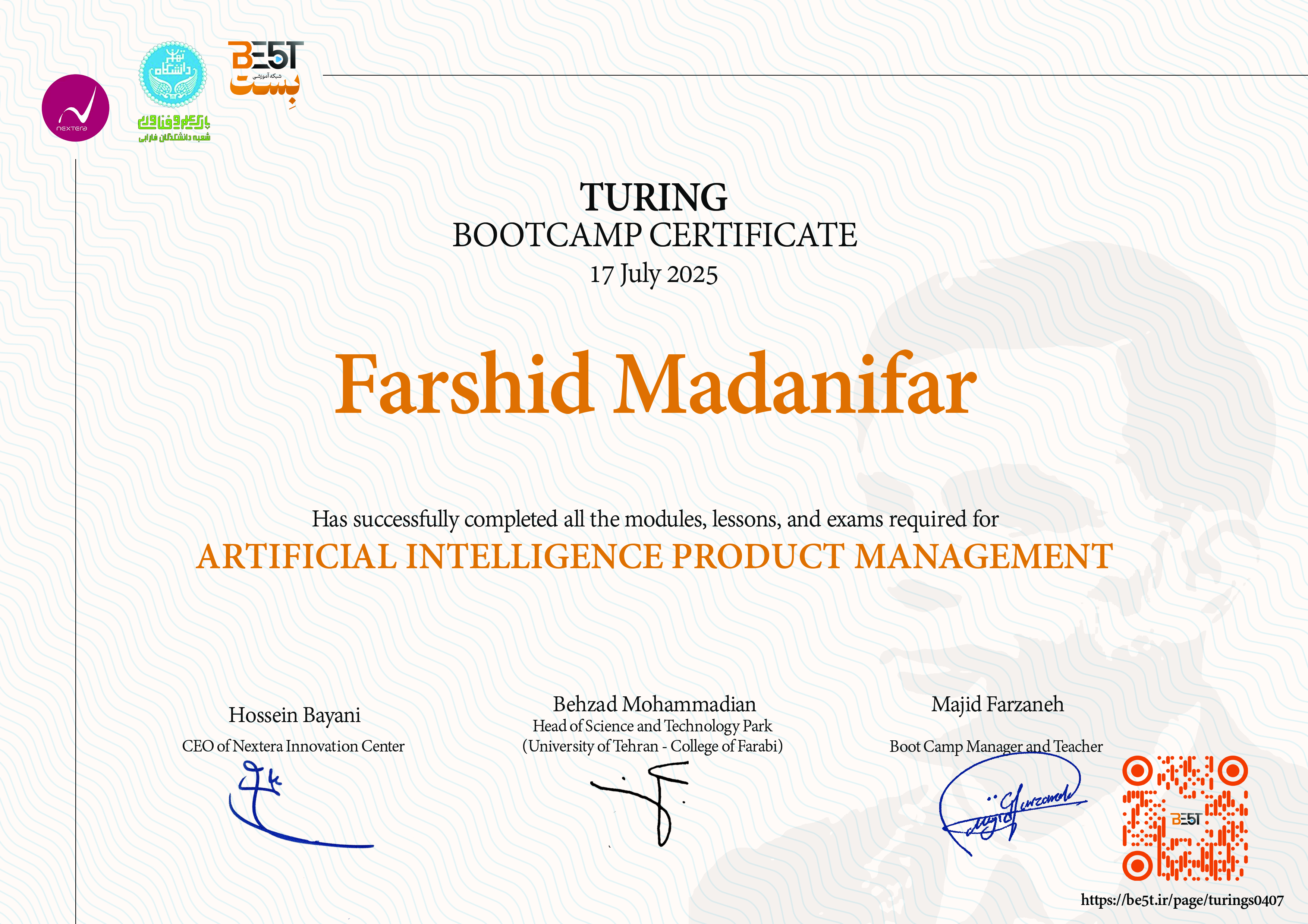 تأیید میشود که فرشید مدنیفر، بوتکمپ آموزشی تورینگ با موضوع مدیریت محصول هوش مصنوعی را با موفقیت به پایان رسانده است.